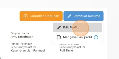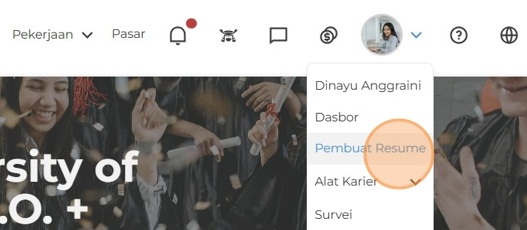 2. Setelah berhasil masuk, Anda akan diarahkan ke dasbor. Arahkan kursor ke ikon profil untuk membuka menu dan pilih Pembuat Resume. Pada halaman profil Anda, klik Pembuat Resume, lalu pilih Edit Profil.