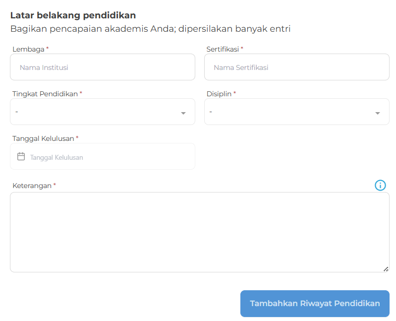 Bagikan pengalaman dan pencapaian akademis Anda. Anda dapat menyertakan lebih dari satu latar belakang pendidikan!