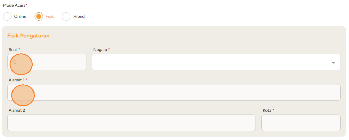 Pilih jika acara dilaksanakan secara tatap muka. Masukkan kapasitas (seat) yang tersedia dan alamat atau lokasi lengkap acara.