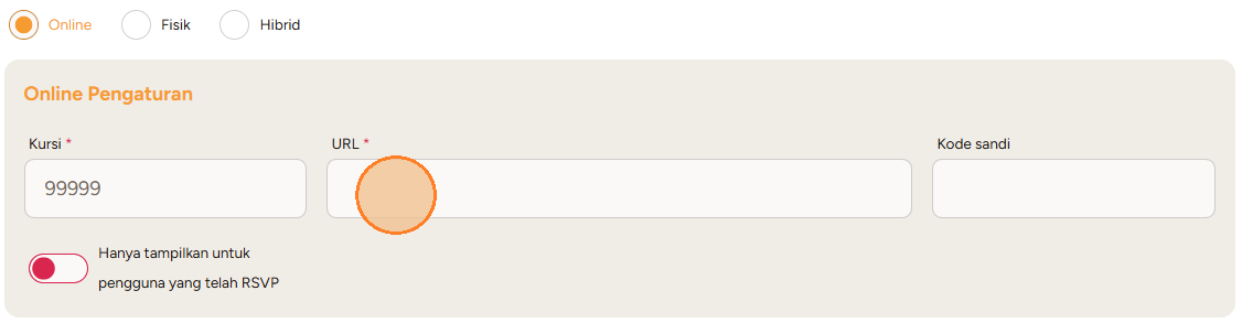 Pilih jika acara dilaksanakan secara daring. Masukkan jumlah kursi yang tersedia serta URL Acara. Nyalakan opsi Hanya tempilkan untuk peserta yang telah RSVP untuk memastikan mereka mendaftar terlebih dahulu sebelum mendapatkan tautannya. Kata sandi bersifat opsional.