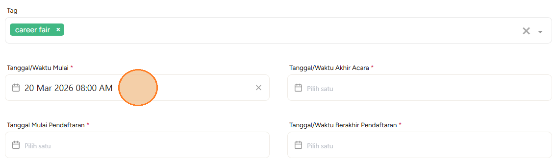 4. Tambahkan Tag untuk membantu mengelompokkan dan mengorganisasi acara sehingga lebih mudah ditemukan oleh pengguna. Tentukan tanggal dan waktu mulai serta berakhir untuk pendaftaran dan juga untuk pelaksanaan event.