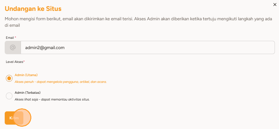 6. Setelah selesai, klik tombol "Kirim" untuk mengirimkan email undangan eksternal ke admin baru yang diundang.