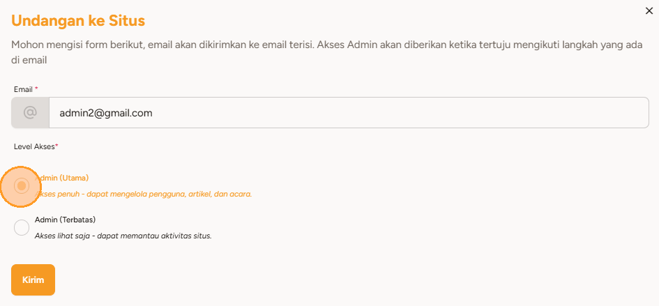 5. Ini akan membuka halaman Undangan Admin. Masukkan alamat email admin baru yang ingin Anda tambahkan, dan pilih Level Akses yang anda ingin berikan untuk admin baru tersebut.