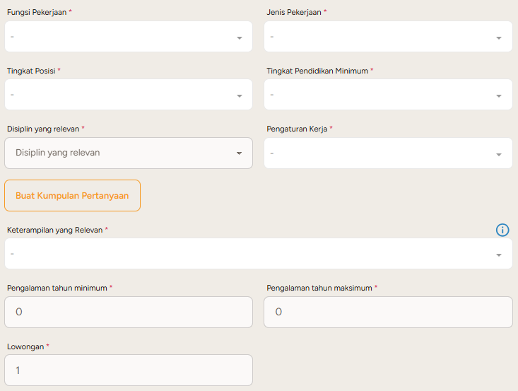 7. Cantumkan informasi relevan yang diperlukan untuk lowongan tersebut, seperti jenis Fungsi, Jenis dan Posisi Pekerjaan, Pengaturan Kerja, serta minimal atau maksimal Tahun Pengalaman Kerja.