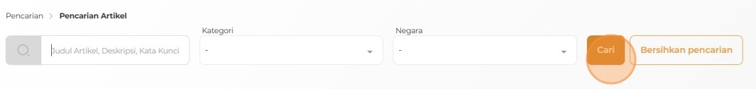 3. Untuk menemukan artikel terkait, masukkan kata kunci atau gunakan filter berdasarkan kategori. Klik Cari untuk melihat hasilnya. Untuk kembali ke tampilan awal, klik Bersihkan Pencarian.