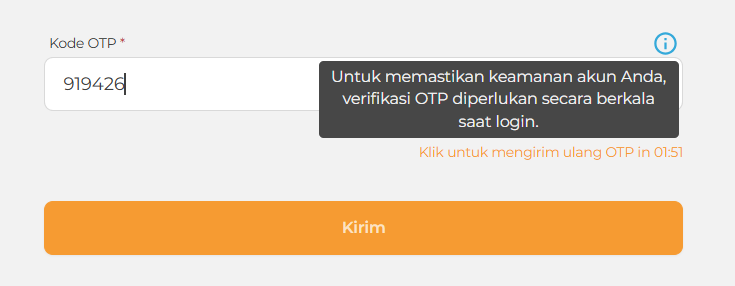 Untuk menjaga keamanan akun Anda, verifikasi OTP (One-Time Password) diperlukan secara berkala saat login. Lapisan keamanan tambahan ini membantu melindungi informasi pribadi dan memastikan hanya pengguna yang berhak yang dapat mengakses akun Anda.