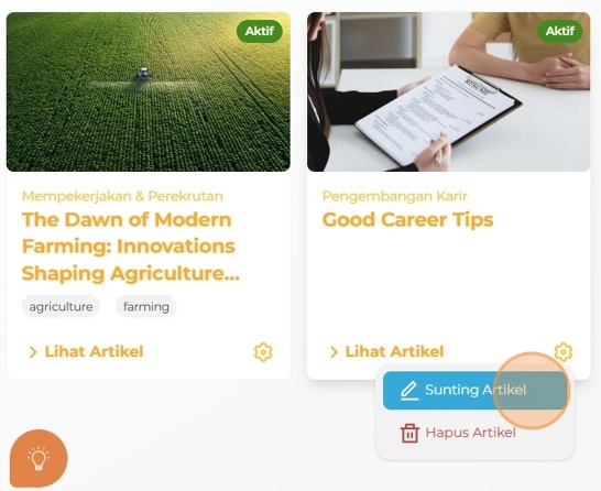 3. Anda akan melihat daftar artikel yang menunggu peninjauan serta artikel yang sudah aktif atau terpublikasi. Untuk mengedit artikel, klik ikon roda gigi dan pilih Sunting Artikel. Anda akan diarahkan kembali ke halaman artikel. Lakukan perubahan yang diperlukan, lalu klik Kirim untuk menyimpannya.