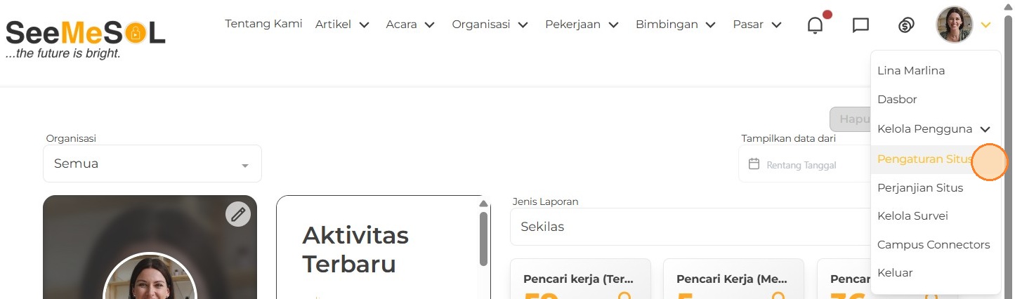 2. Setelah berhasil login, Anda akan diarahkan ke Dasbor. Arahkan kursor ke ikon profil untuk menampilkan menu, lalu klik Pengaturan Situs.