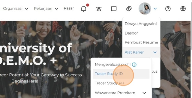 2. Setelah berhasil masuk, Anda akan diarahkan ke dasbor. Arahkan kursor ke ikon profil untuk membuka menu, klik Career Tools, lalu pilih Tracer Study ID (ID untuk Indonesia).